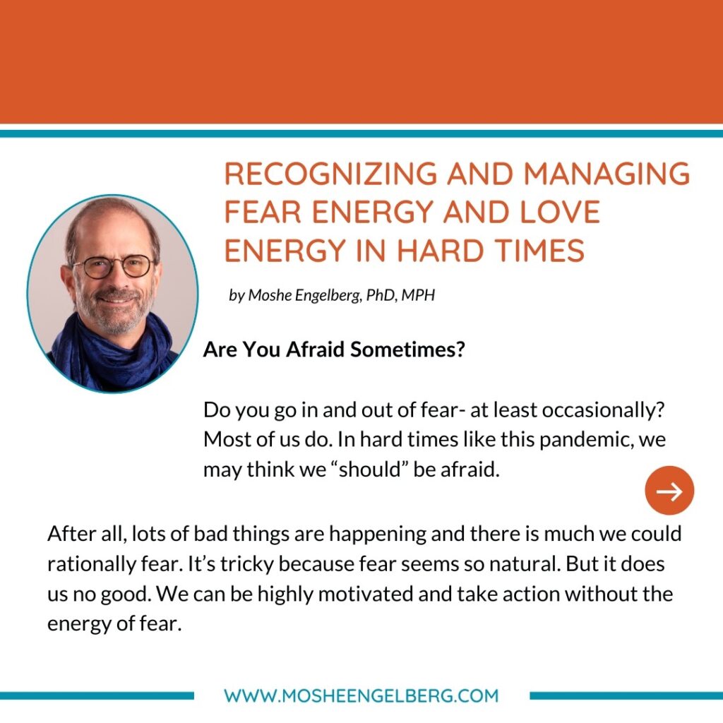 Do you go in and out of fear- at least occasionally? Most of us do. In hard times like this pandemic, we may think we “should” be afraid. After all, lots of bad things are happening and there is much we could rationally fear. It’s tricky because fear seems so natural. But it does us no good. We can be highly motivated and take action without the energy of fear.